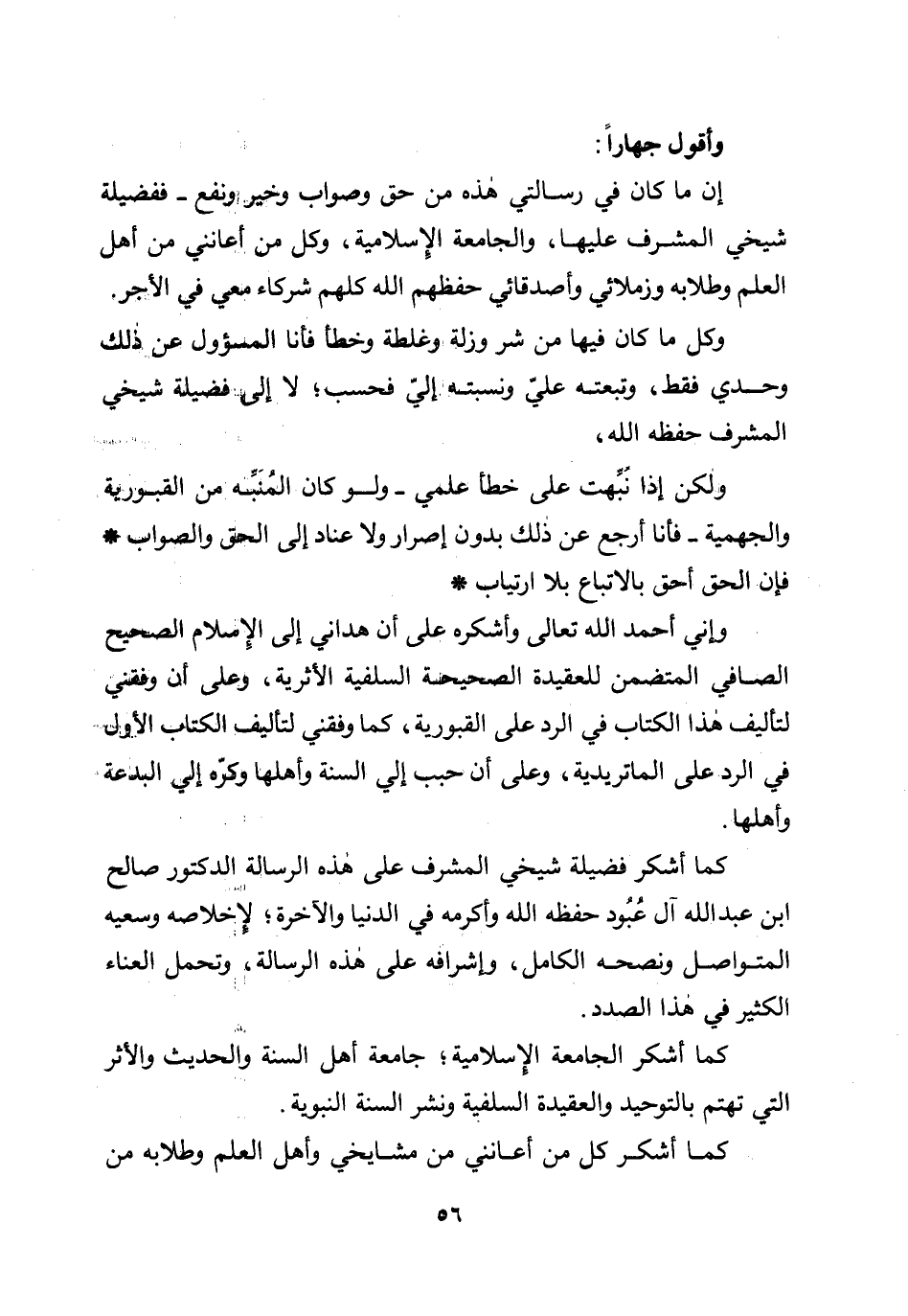 وإني أحمد الله تعالى وأشكره على أن هداني إلى الإسلام الصحيح الصافي المتضمن للعقيدة الصحيحة السلفية الأثرية، وعلى أن وفقني لتأليف هذا الكتاب في الرد على القبورية، كما وفقني لتأليف الكتاب الأول في الرد على الماتريدية، وعلى أن حبب إلي السنة وأهلها وكره إلي البدعة وأهلها.