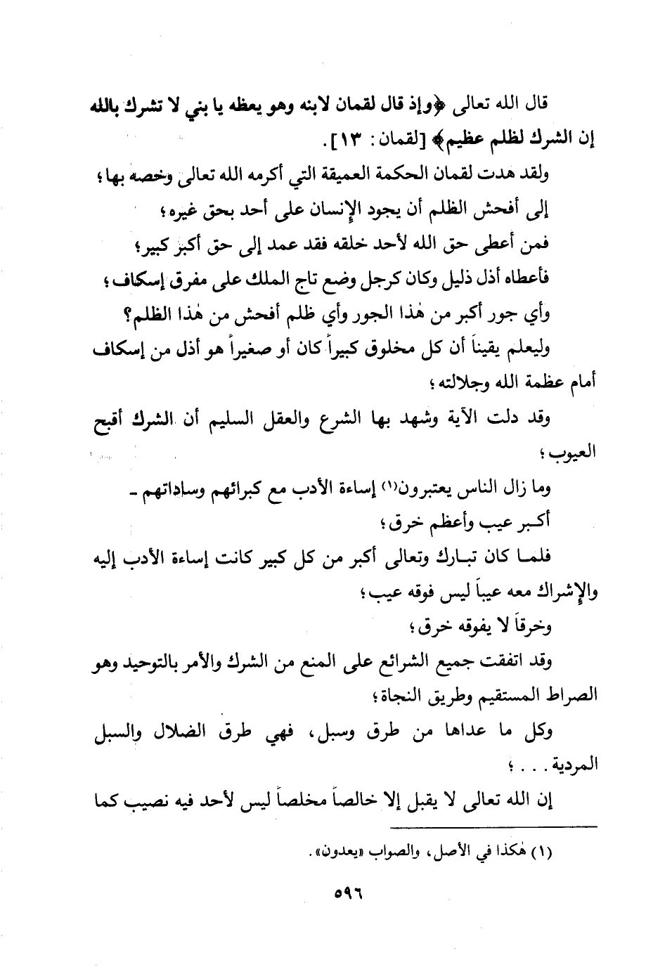 ولقد هدت لقمان الحكمة العميقة التي أكرمه الله تعالى وخصه بها؛ إلى أفحش الظلم أن يجود الإنسان على أحد بحق غيره؛ فمن أعطى حق الله لأحد خلقه فقد عمد إلى حق أكبر كبير؛ فأعطاه أذل ذليل وكان كرجل وضع تاج الملك على مفرق إسكاف؛ وأي جور أكبر من هذا الجور وأي ظلم أفحش من هذا الظلم؟ وليعلم يقينا أن كل مخلوق كبيرا كان أو صغيرا هو أذل من إسكاف أمام عظمة الله وجلالته؛ وقد دلت الآية وشهد بها الشرع والعقل السليم أن الشرك أقبح العيوب؛ وما زال الناس يعتبرون إساءة الأدب مع كبرائهم وسادتهم- أكبر عيب وأعظم خرق؛ فلما كان تبارك وتعالى أكبر من كل كبير كانت إساءة الأدب إليه والإشراك معه عيبا ليس فوقه عيب؛ وخرقا لا يفوقه خرق؛ وقد اتفقت جميع الشرائع على المنع من الشرك والأمر بالتوحيد وهو الصراط المستقيم وطريق النجاة؛ وكل ما عداها من طرق وسبل، فهي طرق الضلال والسبل المردية ... ؛ إن الله تعالى لا يقبل إلا خالصا مخلصا ليس لأحد فيه نصيب كما