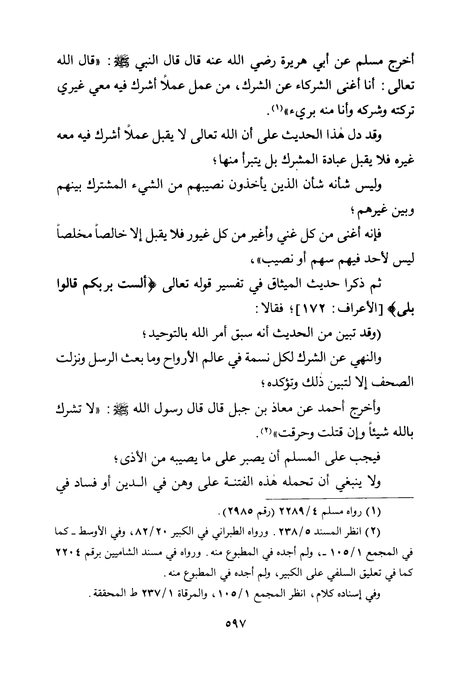 وقد دل هذا الحديث على أن الله تعالى لا يقبل عملا أشرك فيه معه غيره فلا يقبل عبادة المشرك بل يتبرأ منها؛ وليس شأنه شأن الذين يأخذون نصيبهم من الشيء المشترك بينهم وبين غيرهم؛ فإنه أغنى من كل غني وأغير من كل غيور فلا يقبل إلا خالصا مخلصا ليس لأحد فيهم سهم أو نصيب "، ثم ذكرا حديث الميثاق في تفسير قوله تعالى: {أَلَسْتُ بِرَبِّكُمْ قَالُوا بَلَى} [الأعراف:172] ؛ فقالا: (وقد تبين من الحديث أنه سبق أمر الله بالتوحيد؛ والنهي عن الشرك لكل نسمة في عالم الأرواح وما بعث الرسل ونزلت الصحف إلا لتبين ذلك وتؤكده؛ وأخرج أحمد عن معاذ بن جبل قال قال رسول الله صلى الله عليه وسلم: «لا تشرك بالله شيئا وإن قتلت وحرقت» .