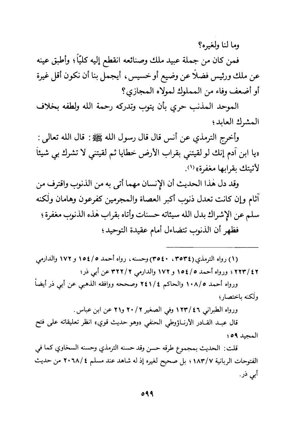 وما لنا ولغيره؟ فمن كان من جملة عبيد ملك وصنائعه انقطع إليه كليّا؛ وأطبق عينه عن ملك ورئيس فضلا عن وضيع أو خسيس، أيجمل بنا أن نكون أقل غيرة أو أضعف وفاء من المملوك لمولاه المجازي؟ الموحد المذنب حري بأن يتوب وتدركه رحمة الله ولطفه بخلاف المشرك العابد؛ وأخرج الترمذي عن أنس قال: قال رسول الله صلى الله عليه وسلم: قال الله تعالى: «يا ابن آدم إنك لو لقيتني بقراب الأرض خطايا ثم لقيتني لا تشرك بي شيئا لأتيتك بقرابها مغفرة» .