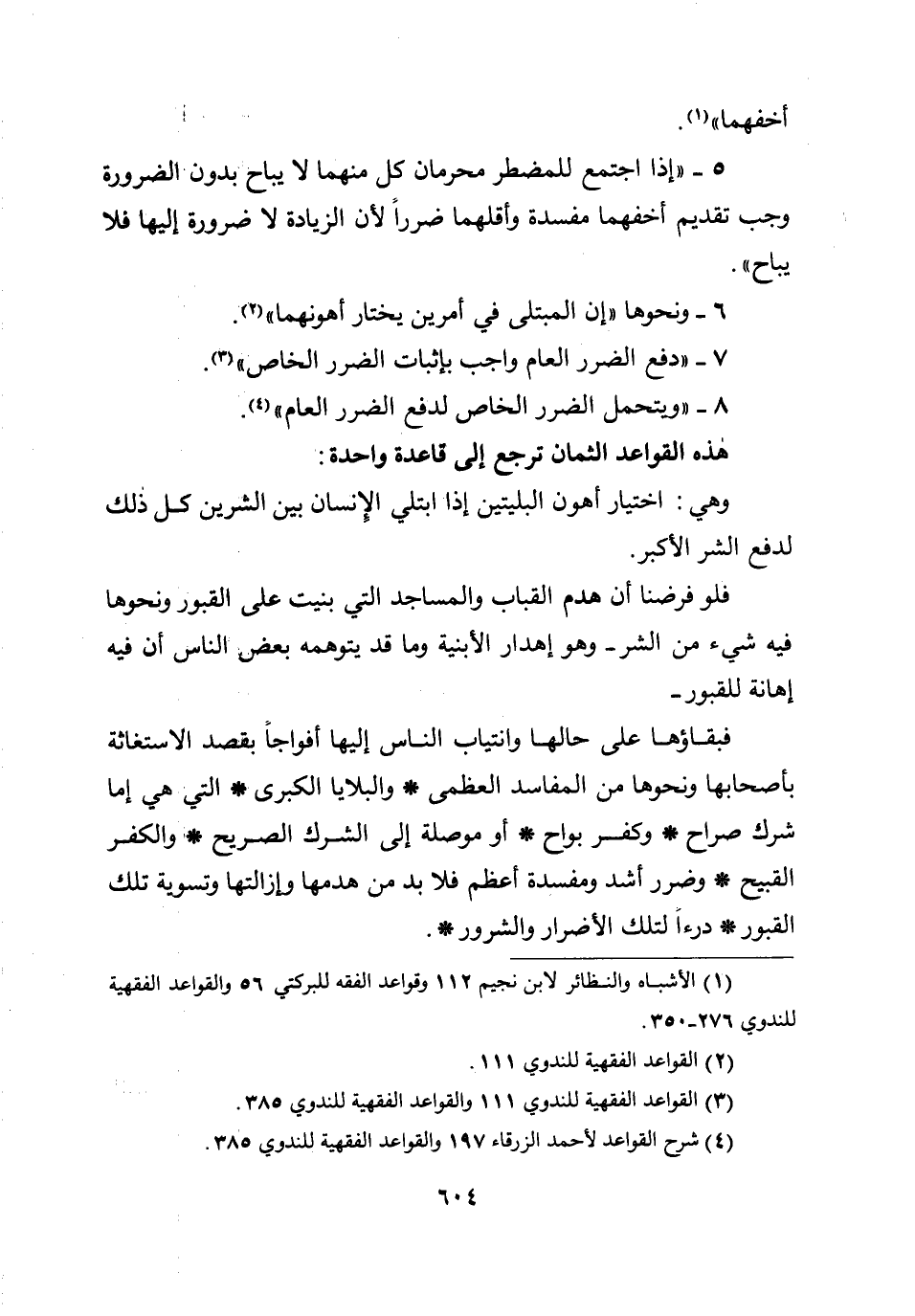 فلو فرضنا أن هدم القباب والمساجد التي بنيت على القبور ونحوها فيه شيء من الشر- وهو إهدار الأبنية وما قد يتوهمه بعض الناس أن فيه إهانة للقبور- فبقاؤها على حالها وانتياب الناس إليها أفواجا بقصد الاستغاثة بأصحابها ونحوها من المفاسد العظمى * والبلايا الكبرى* التي هي إما شرك صراح * وكفر بواح* أو موصلة إلى الشرك الصريح * والكفر القبيح* وضرر أشد ومفسدة أعظم فلا بد من هدمها وإزالتها وتسوية تلك القبور * درءا لتلك الأضرار والشرور*.