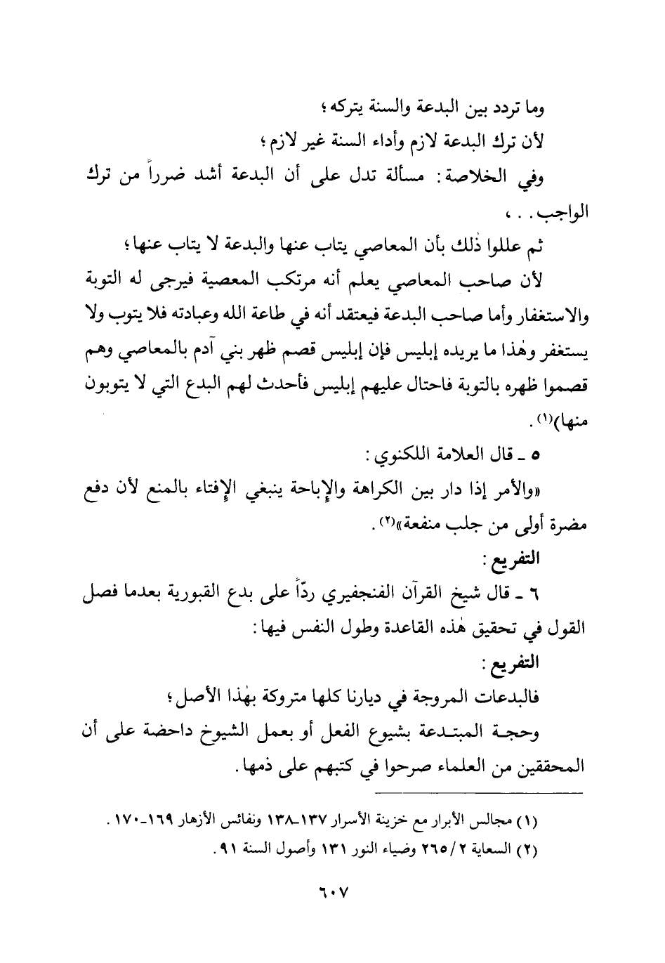 وما تردد بين البدعة والسنة يتركه؛ لأن ترك البدعة لازم وأداء السنة غير لازم؛ وفي الخلاصة: مسألة تدل على أن البدعة أشد ضررا من ترك الواجب ... ثم عللوا ذلك بأن المعاصي يتاب عنها والبدعة لا يتاب عنها؛ لأن صاحب المعاصي يعلم أنه مرتكب المعصية فيرجى له التوبة والاستغفال وأما صاحب البدعة فيعتقد أنه في طاعة الله وعبادته فلا يتوب ولا يستغفر وهذا ما يريده إبليس فإن إبليس قصم ظهر بني آدم بالمعاصي وهم قصموا ظهره بالتوبة فاحتال عليهم إبليس فأحدث لهم البدع التي لا يتوبون منها) .