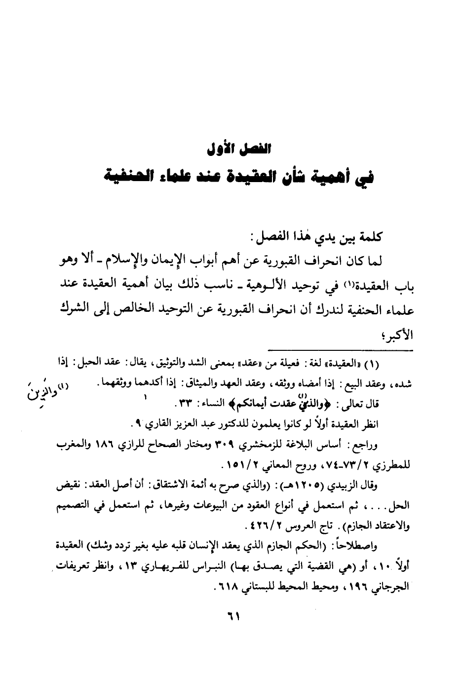 لما كان انحراف القبورية عن أهم أبواب الإيمان والإسلام - ألا وهو باب العقيدة في توحيد الألوهية - ناسب ذلك بيان أهمية العقيدة عند علماء الحنفية لندرك أن انحراف القبورية عن التوحيد الخالص إلى الشرك الأكبر