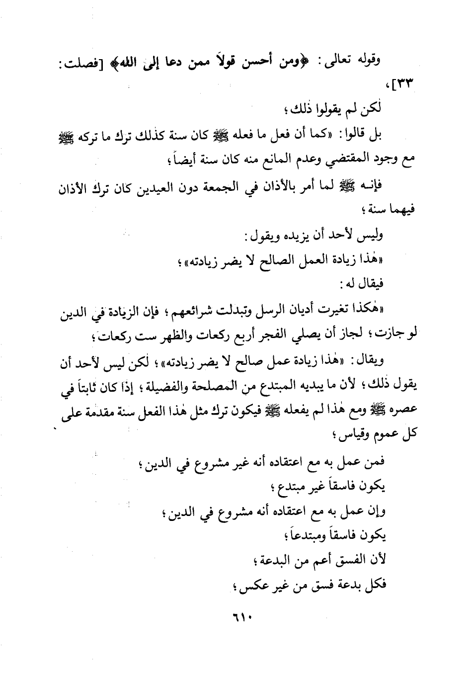 وقوله تعالى: {وَمَنْ أَحْسَنُ قَوْلًا مِمَّنْ دَعَا إِلَى اللَّهِ} [فصلت: 33] ، لكن لم يقولوا ذلك؛ بل قالوا: " كما أن فعل ما فعله صلى الله عليه وسلم كان سنة كذلك ترك ما تركه صلى الله عليه وسلم مع وجود المقتضي وعدم المانع منه كان سنة أيضا؛ فإنه صلى الله عليه وسلم لما أمر بالأذان في الجمعة دون العيدين كان ترك الأذان فيهما سنة؛ وليس لأحد أن يزيده ويقول: