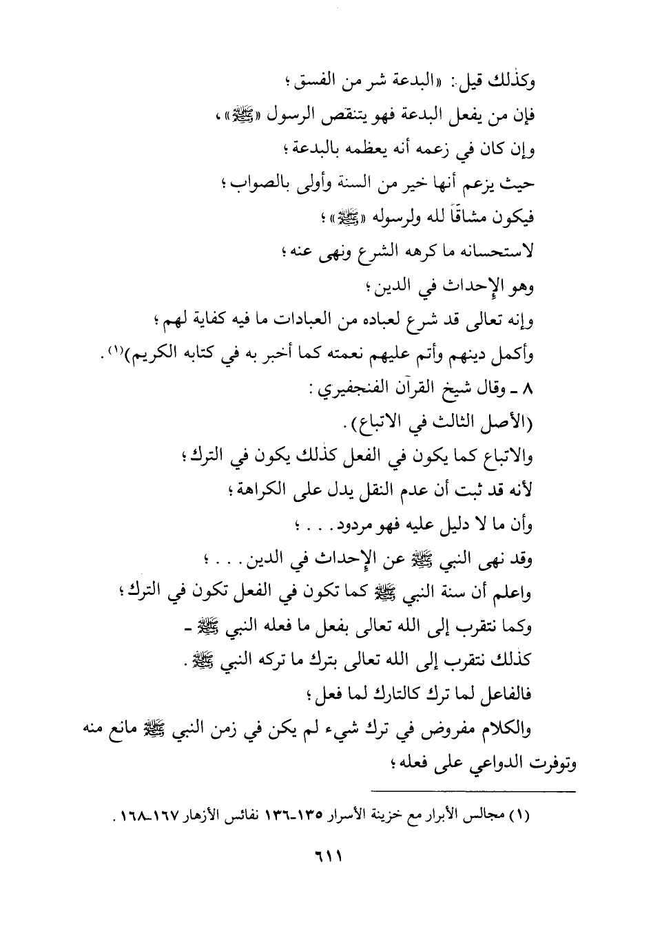 والاتباع كما يكون في الفعل كذلك يكون في الترك؛ لأنه قد ثبت أن عدم النقل يدل على الكراهة؛ وأن ما لا دليل عليه فهو مردود ... ؛ وقد نهى النبي صلى الله عليه وسلم عن الإحداث في الدين ... ؛ واعلم أن سنة النبي صلى الله عليه وسلم كما تكون في الفعل تكون في الترك؛ وكما نتقرب إلى الله تعالى بفعل ما فعله النبي صلى الله عليه وسلم- كذلك نتقرب إلى الله تعالى بترك ما تركه النبي صلى الله عليه وسلم- فالفاعل لما ترك كالتارك لما فعل؛ والكلام مفروض في ترك شيء لم يكن في زمن النبي صلى الله عليه وسلم مانع منه وتوفرت الدواعي على فعله؛