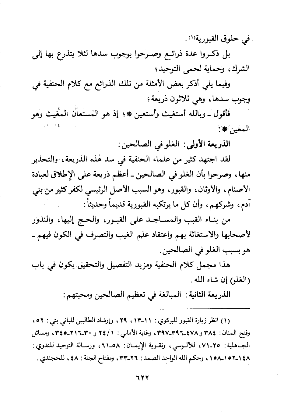 بل ذكروا عدة ذرائع وصرحوا بوجوب سدها لئلا يتذرع بها إلى الشرك، وحماية لحمى التوحيد؛ وفيما يلي أذكر بعض الأمثلة من تلك الذرائع مع كلام الحنفية في وجوب سدها، وهي ثلاثون ذريعة؛ فأقول- وبالله أستغيث وأستعين*؛ إذ هو المستعان المغيث وهو المعين*: