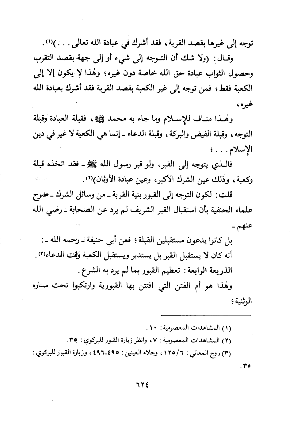 وقال: (ولا شك أن التوجه إلى شيء أو إلى جهة بقصد التقرب وحصول الثواب عبادة حق الله خاصة دون غيره؛ وهذا لا يكون إلا إلى الكعبة فقط؛ فمن توجه إلى غير الكعبة بقصد القربة فقد أشرك بعبادة الله غيره، وهذا مناف للإسلام وما جاء به محمد صلى الله عليه وسلم، فقبلة العبادة وقبلة التوجه، وقبلة الفيض والبركة، وقبلة الدعاء- إنما هي الكعبة لا غير في دين الإسلام ... ، فالذي يتوجه إلى القبر، ولو قبر رسول الله صلى الله عليه وسلم فقد اتخذه قبلة وكعبة، وذلك عين الشرك الأكبر، وعين عبادة الأوثان) .