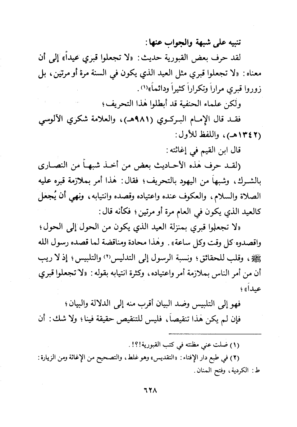 (لقد حرف هذه الأحاديث بعض من أخذ شبها من النصارى بالشرك، وشبها من اليهود بالتحريف؛ فقال: هذا أمر بملازمة قبره عليه الصلاة والسلام، والعكوف عنده واعتياده وقصده وانتيابه، ونهي أن يُجعل كالعيد الذي يكون في العام مرة أو مرتين؛ فكأنه قال: " لا تجعلوا قبري بمنزلة العيد الذي يكون من الحول إلى الحول؛ واقصدوه كل وقت وكل ساعة ". وهذا محادة ومناقضة لما قصده رسول الله صلى الله عليه وسلم، وقلب للحقائق؛ ونسبة الرسول إلى التدليس والتلبيس؛ إذ لا ريب أن من أمر الناس بملازمة أمر واعتياده، وكثرة انتيابه بقوله: «لا تجعلوا قبري عيدا» ؛ فهو إلى التلبيس وضد البيان أقرب منه إلى الدلالة والبيان؛ فإن لم يكن هذا تنقيصا، فليس للتنقيص حقيقة فينا؛ ولا شك: أن