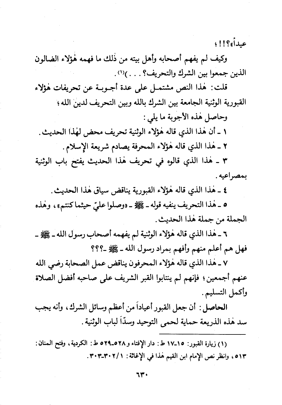 الحاصل: أن جعل القبور أعيادا من أعظم وسائل الشرك، وأنه يجب سد هذه الذريعة حماية لحمى التوحيد وسدّا لباب الوثنية.