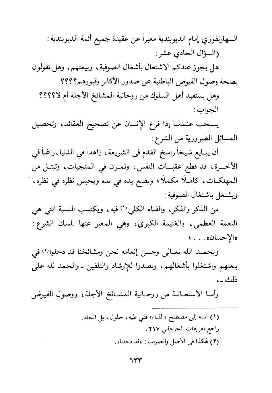 من الذكر والفكر، والفناء الكلي فيه، ويكتسب النسبة التي هي النعمة العظمى، والغنيمة الكبرى، وهي المعبر عنها بلسان الشرع: " الإحسان " ... ؛ وبحمد الله تعالى وحسن إنعامه نحن ومشائخنا قد دخلوا في بيعتهم واشتغلوا بأشغالهم، وتصدوا للإرشاد والتلقين- والحمد لله على ذلك-، وأما الاستعانة من روحانية المشائخ الأجلة، ووصول الفيوض
