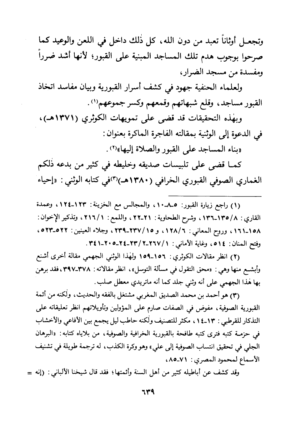 وتجعل أوثانا تعبد من دون الله، كل ذلك داخل في اللعن والوعيد كما صرحوا بوجوب هدم تلك المساجد المبنية على القبور؛ لأنها أشد ضررا ومفسدة من مسجد الضرار، ولعلماء الحنفية جهود في كشف أسرار القبورية وبيان مفاسد اتخاذ القبور مساجد، وقلع شبهاتهم وقمعهم وكسر جموعهم.