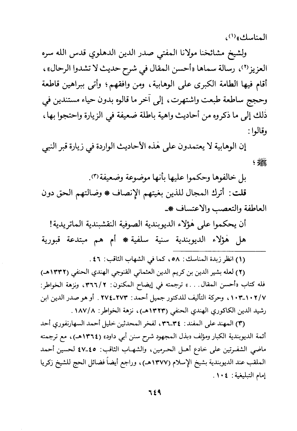 المناسك "، ولشيخ مشائخنا مولانا المفتي صدر الدين الدهلوي قدس الله سره العزيز، رسالة سماها " أحسن المقال في شرح حديث لا تشدوا الرحال "، أقام فيها الطامة الكبرى على الوهابية، ومن وافقهم؛ وأتى ببراهين قاطعة وحجج ساطعة طبعت واشتهرت، إلى آخر ما قالوه بدون حياء مستندين في ذلك إلى ما ذكروه من أحاديث واهية باطلة ضعيفة في الزيارة واحتجوا بها، وقالوا: