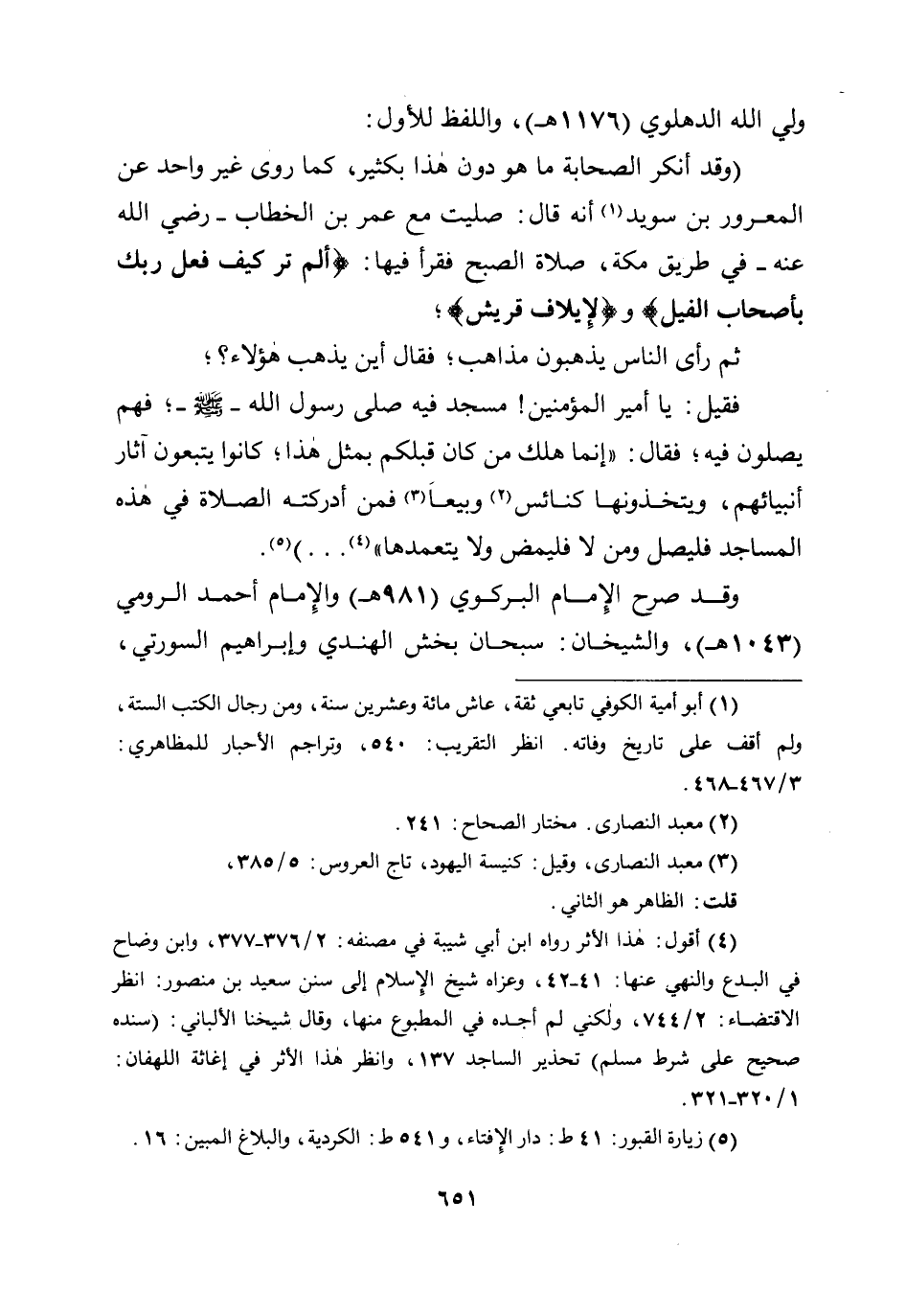 (وقد أنكر الصحابة ما هو دون هذا بكثير، كما روى غير واحد عن المعرور بن سويد أنه قال: صليت مع عمر بن الخطاب رضي الله عنه في طريق مكة، صلاة الصبح فقرأ فيها: {أَلَمْ تَرَ كَيْفَ فَعَلَ رَبُّكَ بِأَصْحَابِ الْفِيلِ} و {لِإِيلَافِ قُرَيْشٍ} ؛ ثم رأى الناس يذهبون مذاهب؛ فقال أين يذهب هؤلاء؟؛ فقيل: يا أمير المؤمنين! مسجد فيه صلى رسول الله-صلى الله عليه وسلم-؛ فهم يصلون فيه؛ فقال: " إنما هلك من كان قبلكم بمثل هذا؛ كانوا يتبعون آثار أنبيائهم، ويتخذونها كنائس وبيعا فمن أدركته الصلاة في هذه المساجد فليصل ومن لا فليمض ولا يتعمدها " ... ) .