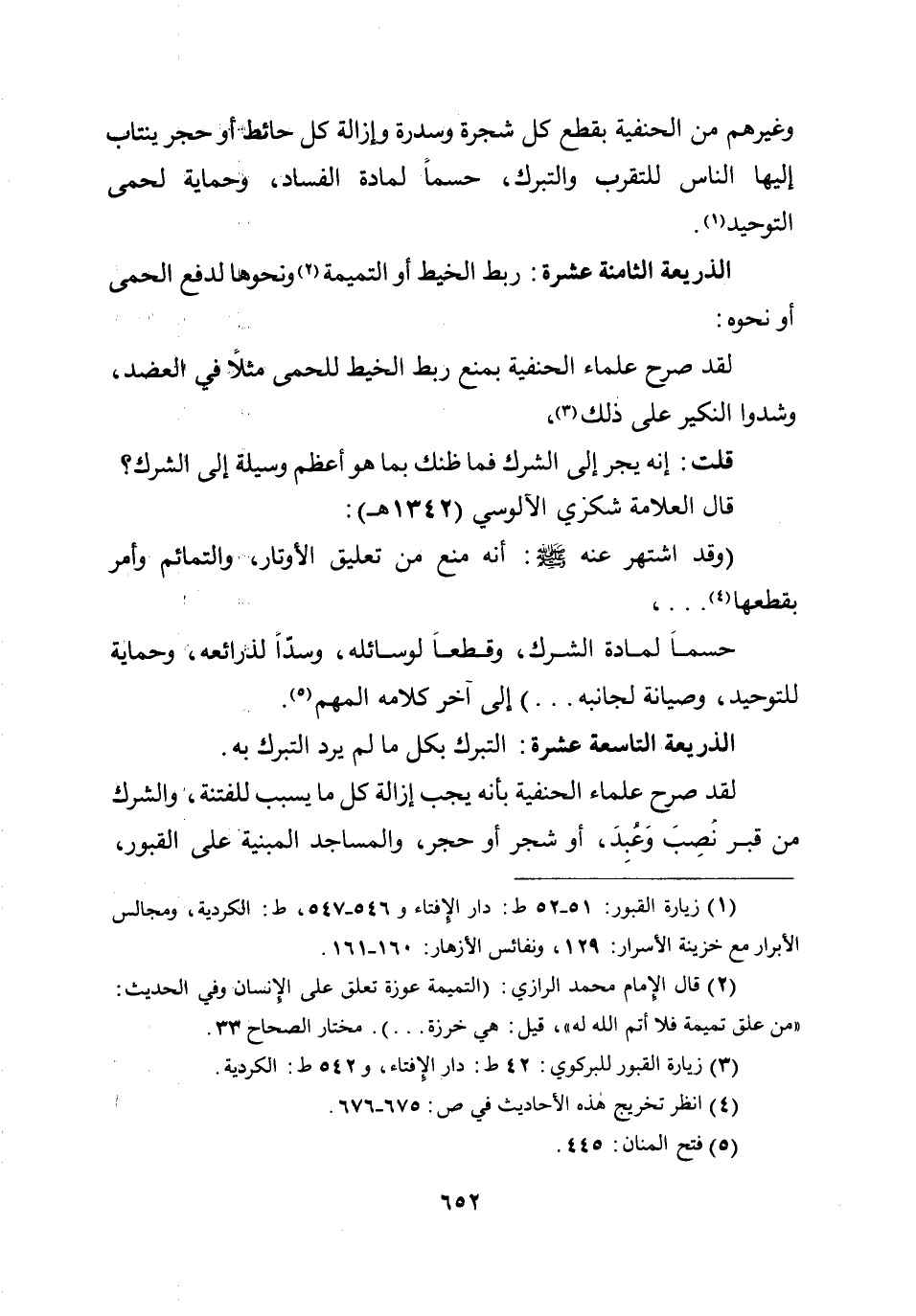 وغيرهم من الحنفية بقطع كل شجرة وسدرة وإزالة كل حائط أو حجر ينتاب إليها الناس للتقرب والتبرك، حسما لمادة الفساد، وحماية لحمى التوحيد.