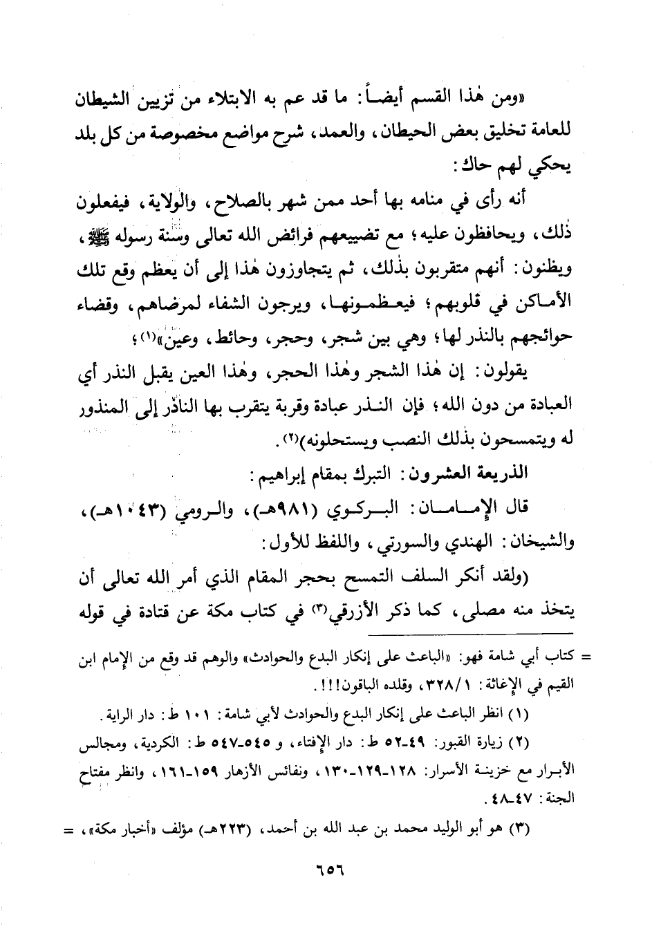 " ومن هذا القسم أيضا: ما قد عم به الابتلاء من تزيين الشيطان للعامة تخليق بعض الحيطان، والعمد، شرح مواضع مخصوصة من كل بلد يحكي لهم حاك: