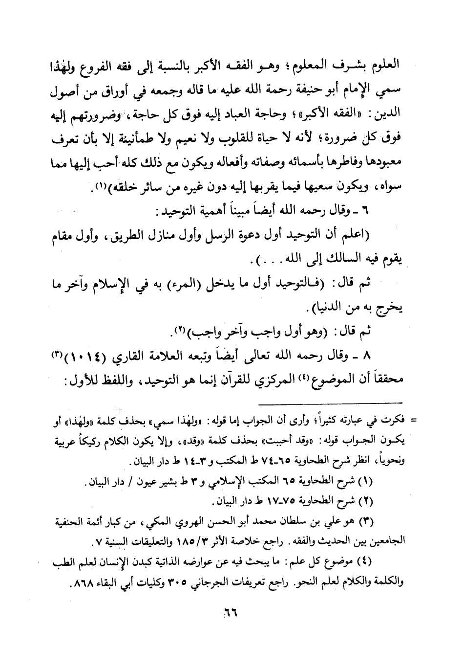 العلوم بشرف المعلوم؛ وهو الفقه الأكبر بالنسبة إلى فقه الفروع ولهذا سمي الإمام أبو حنيفة رحمة الله عليه ما قاله وجمعه في أوراق من أصول الدين: ((الفقه الأكبر)) ؛ وحاجة العباد إليه فوق كل حاجة، وضرورتهم إليه فوق كل ضرورة؛ لأنه لا حياة للقلوب ولا نعيم ولا طمأنينة إلا بأن تعرف معبودها وفاطرها بأسمائه وصفاته وأفعاله ويكون مع ذلك كله أحب إليها مما سواه، ويكون سعيها فيما يقربها إليه دون غيره من سائر خلقه) .