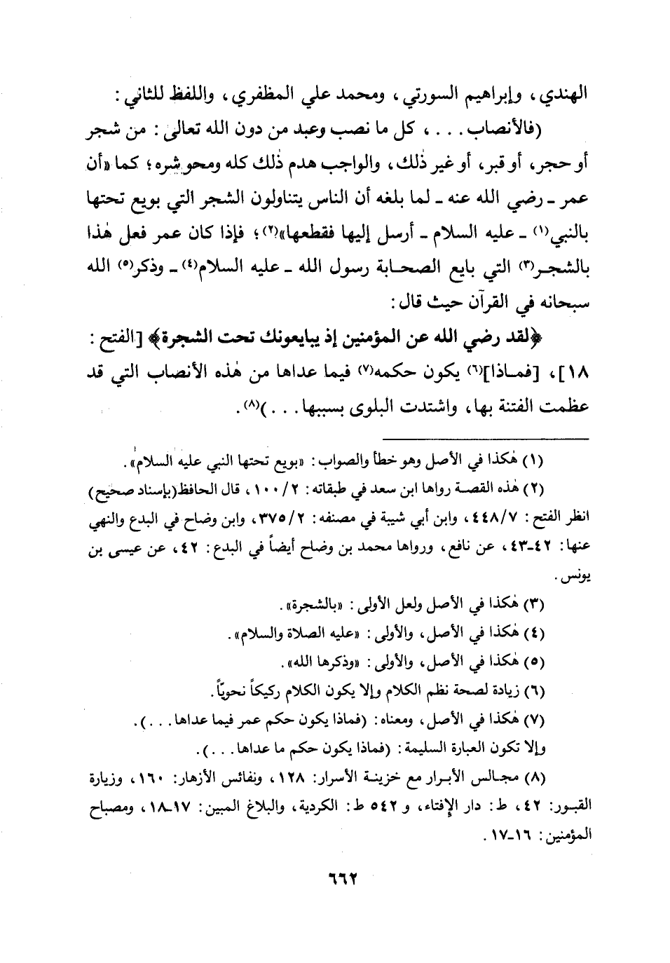 (فالأنصاب ... ، كل ما نصب وعبد من دون الله تعالى: من شجر أو حجر، أو قبر، أو غير ذلك، والواجب هدم ذلك كله ومحو شره؛ كما " أن عمر -رضي الله عنه- لما بلغه أن الناس يتناولون الشجر التي بويع تحتها بالنبي- عليه السلام- أرسل إليها فقطعها "؛ فإذا كان عمر فعل هذا بالشجر التي بايع الصحابة رسول الله-عليه السلام- وذكر الله سبحانه في القرآن حيث قال: