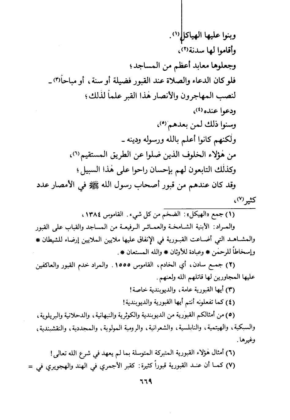 وأقاموا لها سدنة، وجعلوها معابد أعظم من المساجد؛ فلو كان الدعاء والصلاة عند القبور فضيلة أو سنة، أو مباحا- لنصب المهاجرون والأنصار هذا القبر علما لذلك؛ ودعوا عنده، وسنوا ذلك لمن بعدهم، ولكنهم كانوا أعلم بالله ورسوله ودينه- من هؤلاء الخلوف الذين ضلوا عن الطريق المستقيم، وكذلك التابعون لهم بإحسان راحوا على هذا السبيل؛ وقد كان عندهم من قبور أصحاب رسول الله صلى الله عليه وسلم في الأمصار عدد كثير،