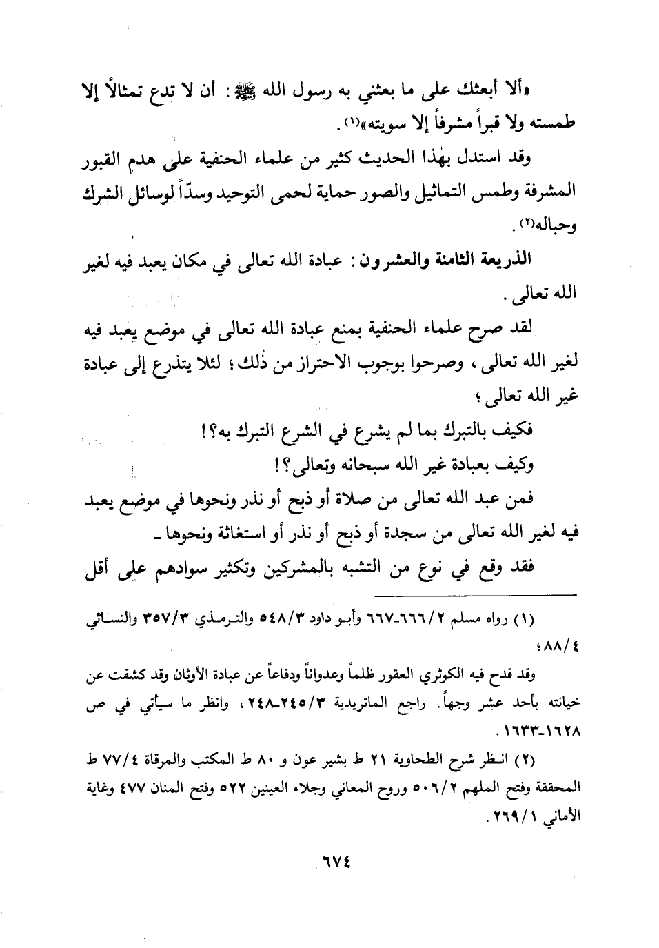 " «ألا أبعثك على ما بعثني به رسول الله صلى الله عليه وسلم: أن لا تدع تمثالا إلا طمسته ولا قبرا مشرفا إلا سويته» ".