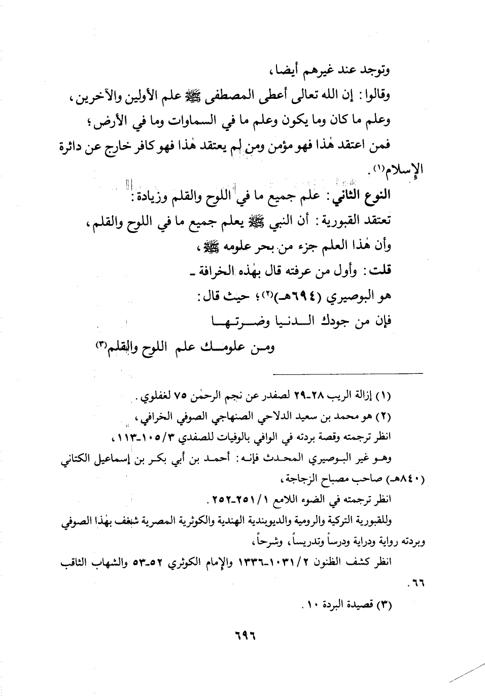 وتوجد عند غيرهم أيضا، وقالوا:إن الله تعالى أعطى المصطفى صلى الله عليه وسلم علم الأولين والآخرين، وعلم ما كان وما يكون وعلم ما في السماوات وما في الأرض؛ فمن اعتقد هذا فهو مؤمن ومن لم يعتقد هذا فهو كافر خارج عن دائرة الإسلام.