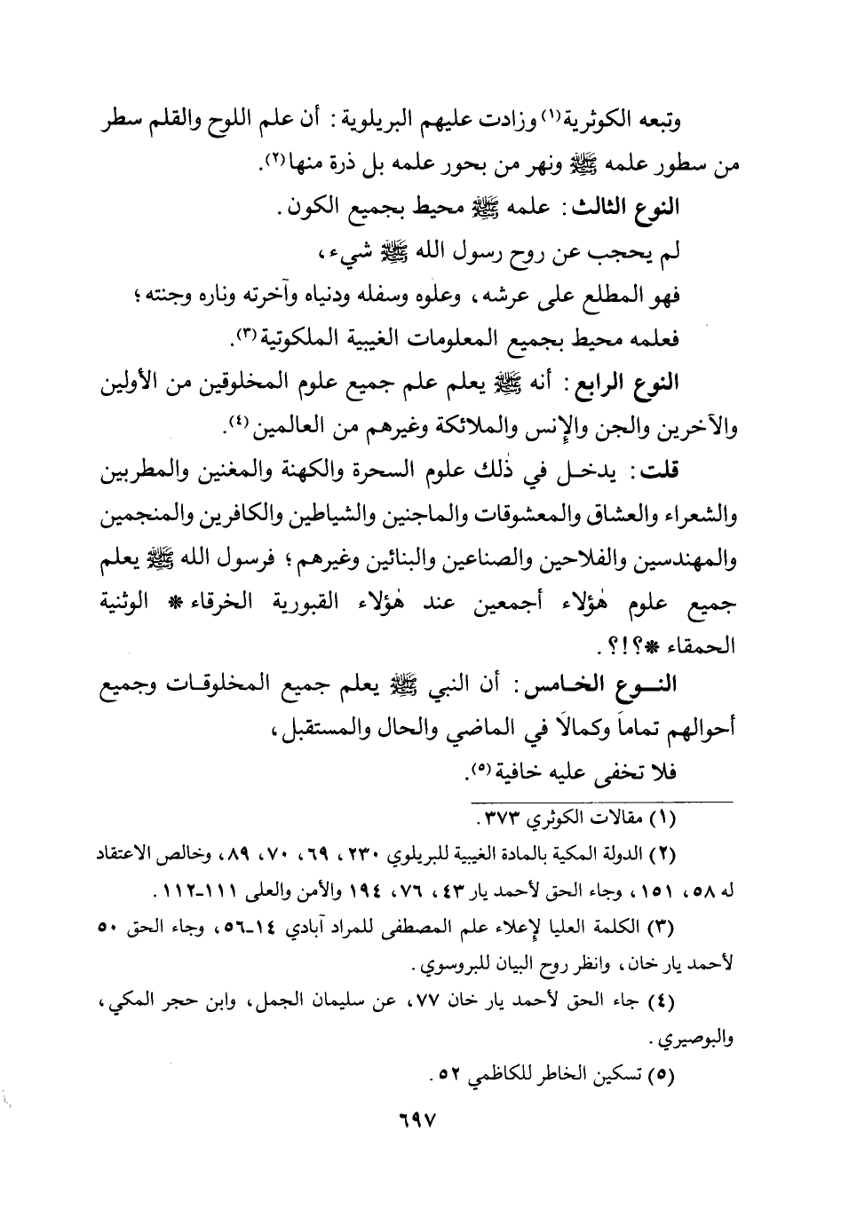 وتبعه الكوثرية وزادت عليهم البريلوية: أن علم اللوح والقلم سطر من سطور علمه صلى الله عليه وسلم ونهر من بحور علمه بل ذرة منها.