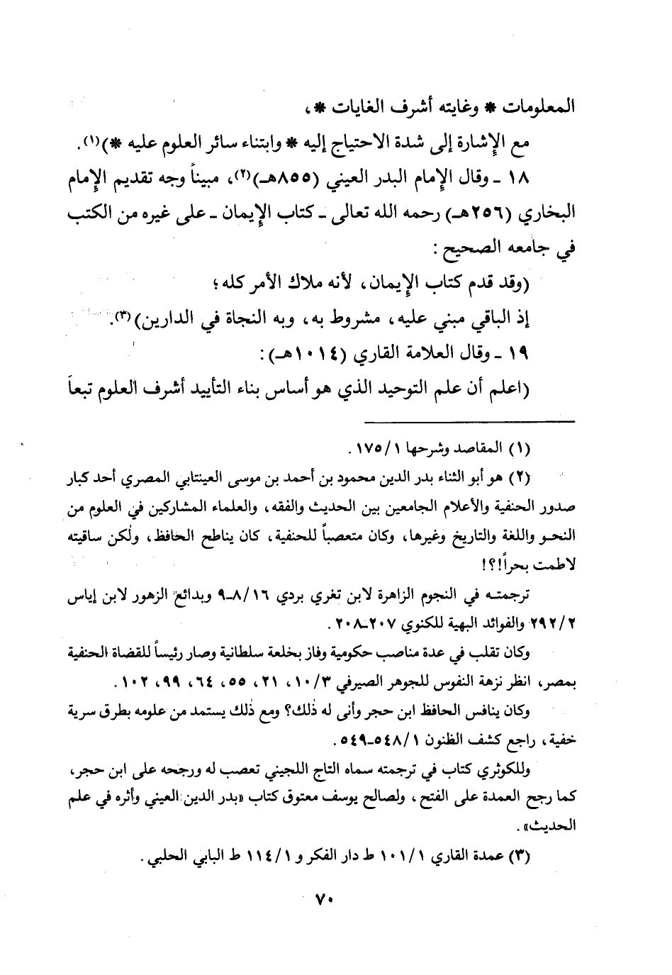 18 - وقال الإمام البدر العيني (855هـ) ، مبينًا وجه تقديم الإمام البخاري (256هـ) رحمه الله تعالى - كتاب الإيمان - على غيره من الكتب في جامعه الصحيح: