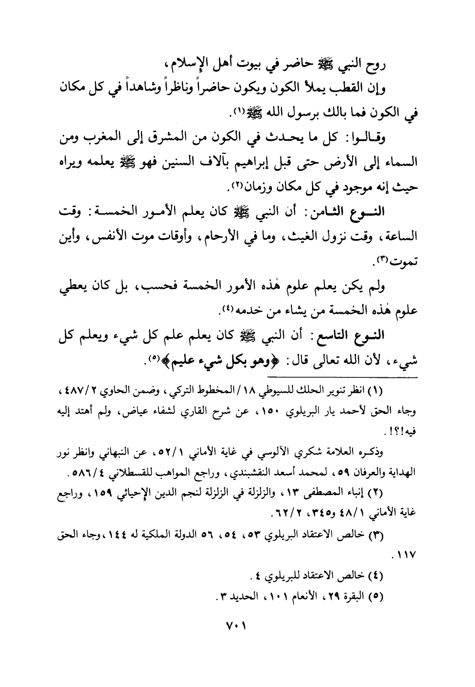 وقالوا: كل ما يحدث في الكون من المشرق إلى المغرب ومن السماء إلى الأرض حتى قبل إبراهيم بآلاف السنين فهو صلى الله عليه وسلم يعلمه ويراه حيث إنه موجود في كل مكان وزمان.