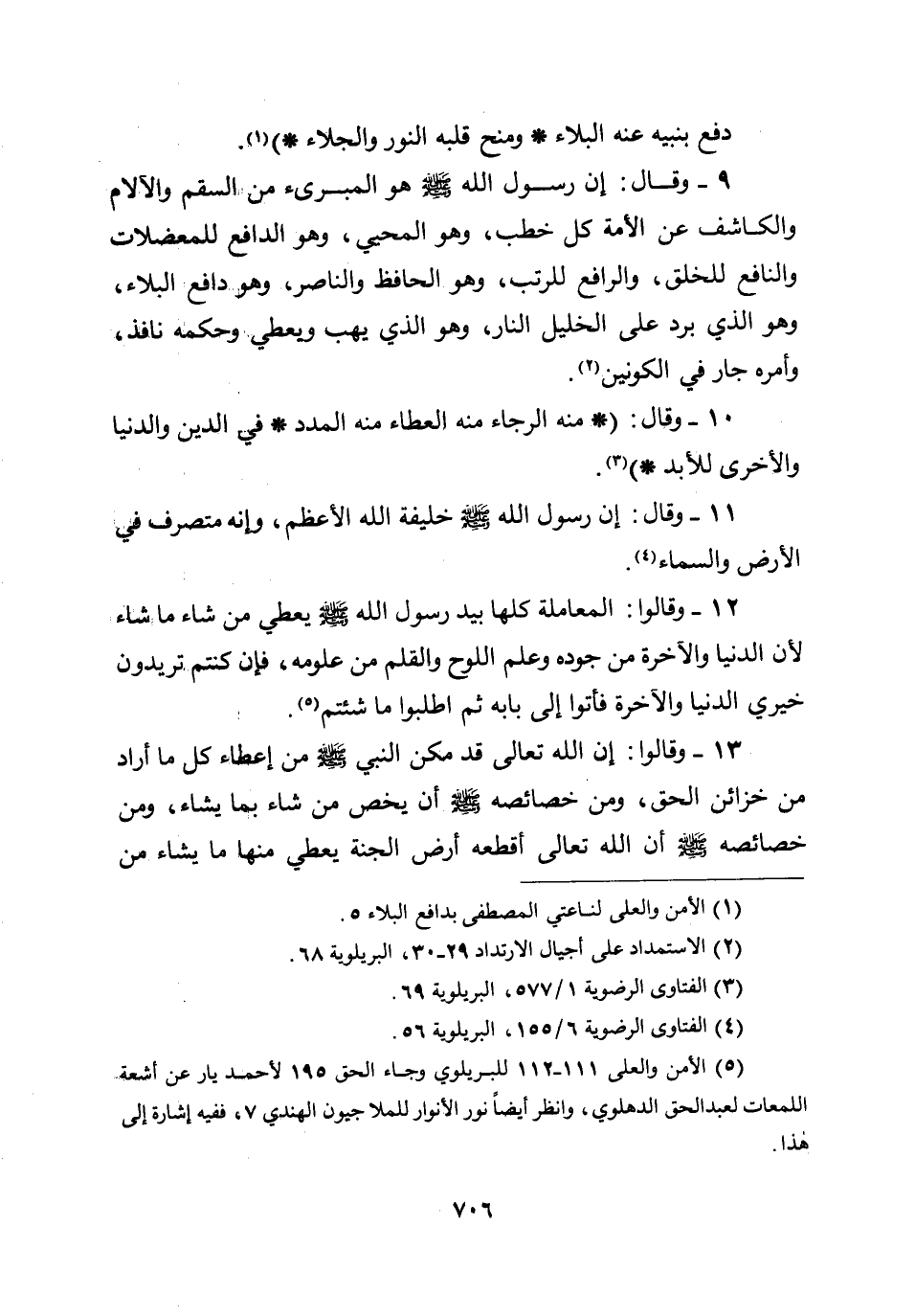 9 - وقال: إن رسول الله صلى الله عليه وسلم هو المبرئ من السقم والآلام والكاشف عن الأمة كل خطب، وهو المحيي، وهو الدافع للمعضلات والنافع للخلق، والرافع للرتب، وهو الحافظ والناصر، وهو دافع البلاء، وهو الذي برد على الخليل النار، وهو الذي يهب ويعطي وحكمه نافذ، وأمره جار في الكونين.