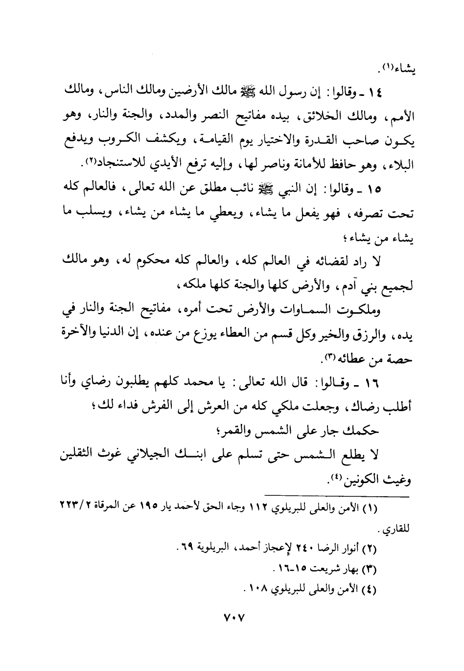 14 - وقالوا: إن رسول الله صلى الله عليه وسلم مالك الأرضين ومالك الناس، ومالك الأمم، ومالك الخلائق، بيده مفاتيح النصر والمدد، والجنة والنار، وهو يكون صاحب القدرة والاختيار يوم القيامة، ويكشف الكروب ويدفع البلاء، وهو حافظ للأمانة وناصر لها، وإليه ترفع الأيدي للاستنجاد.