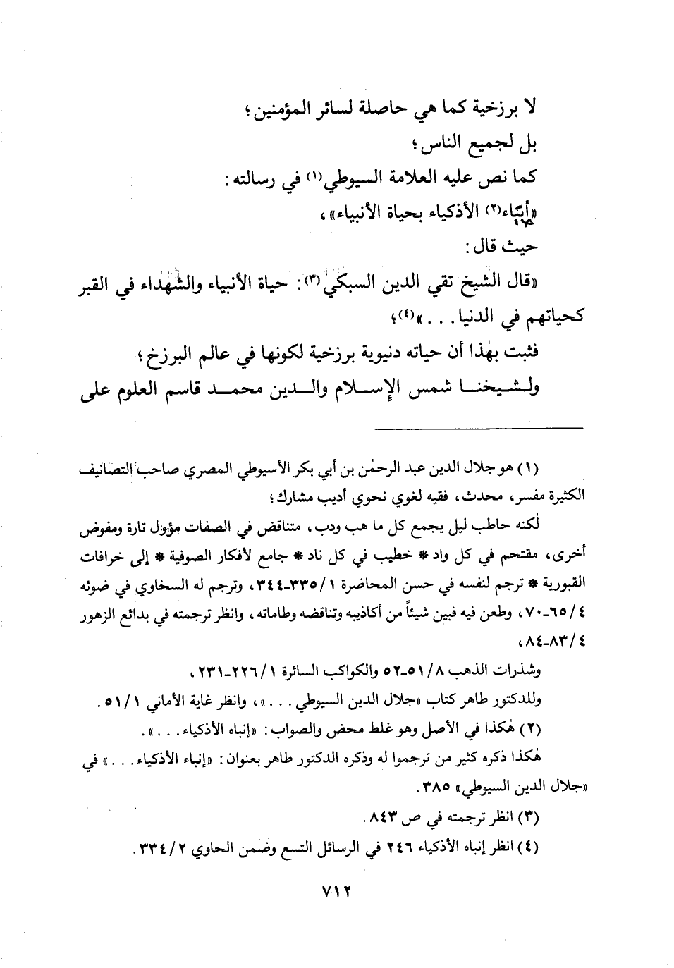 " أبناء الأذكياء بحياة الأنبياء "، حيث قال: " قال الشيخ تقي الدين السبكي: حياة الأنبياء والشهداء في القبر كحياتهم في الدنيا ... "؛ فثبت بهذا أن حياته دنيوية برزخية لكونها في عالم البرزخ؛ ولشيخنا شمس الإسلام والدين محمد قاسم العلوم على