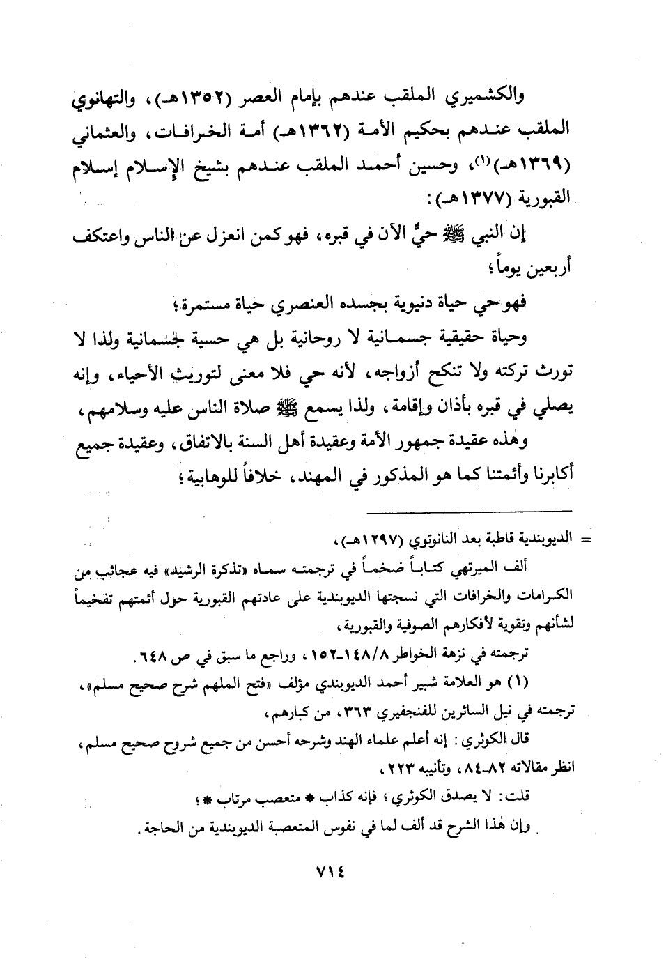 والكشميري الملقب عندهم بإمام العصر (1352هـ) ، والتهانوي الملقب عندهم بحكيم الأمة (1362هـ) أمة الخرافات، والعثماني (1369هـ) ، وحسين أحمد الملقب عندهم بشيخ الإسلام إسلام القبورية (1377هـ) :