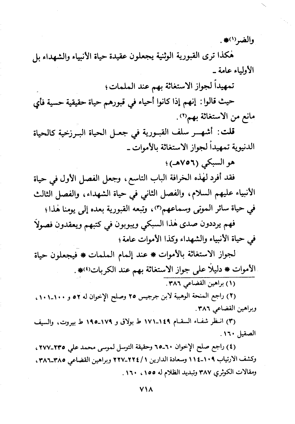 قلت: أشهر سلف القبورية في جعل الحياة البرزخية كالحياة الدنيوية تمهيدا لجواز الاستغاثة بالأموات- هو السبكي (756هـ) ؛ فقد أفرد لهذه الخرافة الباب التاسع، وجعل الفصل الأول في حياة الأنبياء عليهم السلام، والفصل الثاني في حياة الشهداء، والفصل الثالث في حياة سائر الموتى وسماعهم، وتبعه القبورية بعده إلى يومنا هذا؛ فهم يرددون صدى هذا السبكي ويبوبون في كتبهم ويعقدون فصولا في حياة الأنبياء والشهداء وكذا الأموات عامة؛ لجواز الاستغاثة بالأموات* عند إلمام الملمات* فيجعلون حياة الأموات* دليلا على جواز الاستغاثة بهم عند الكربات*.