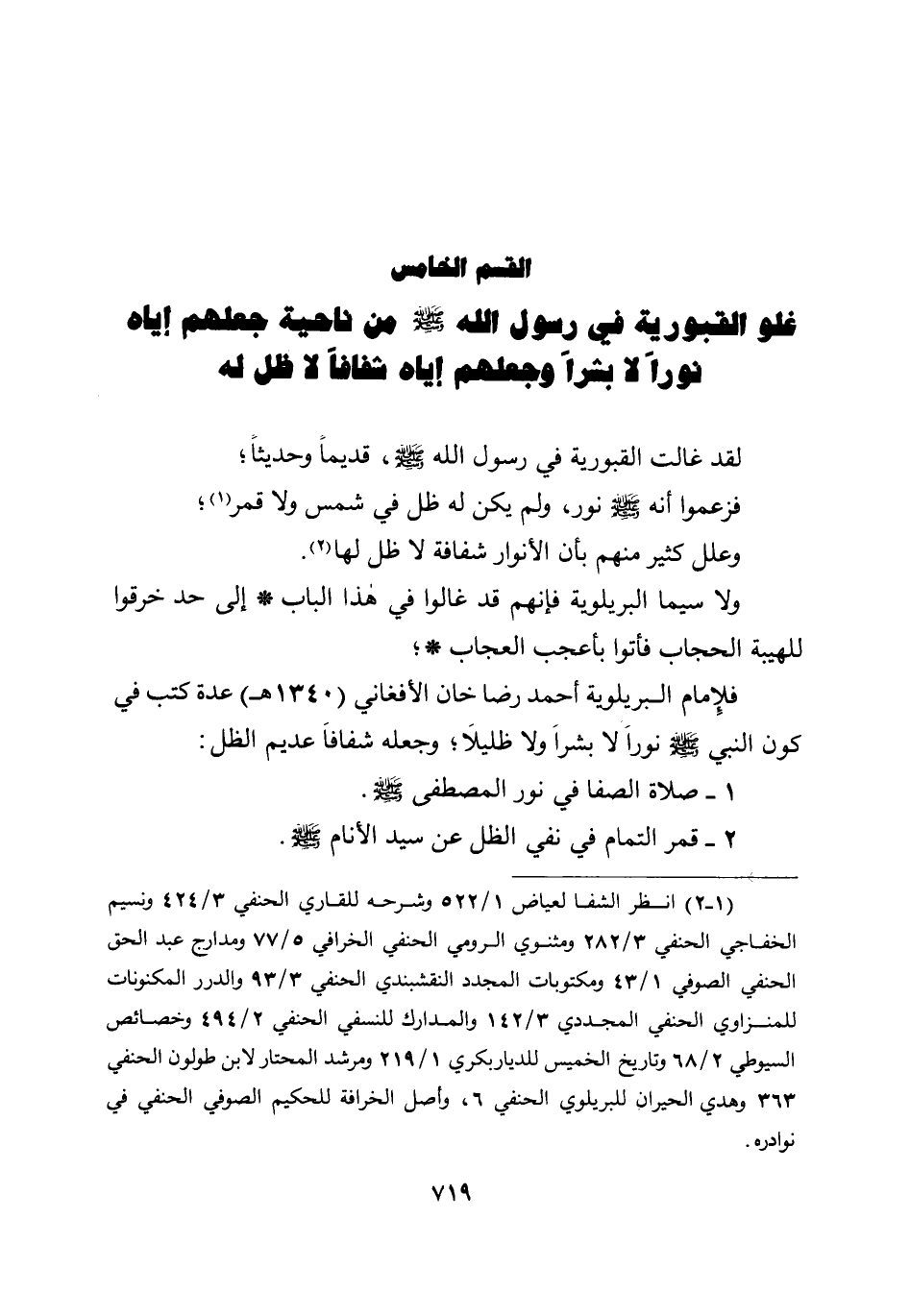 ولا سيما البريلوية فإنهم قد غالوا في هذا الباب* إلى حد خرقوا للهيبة الحجاب فأتوا بأعجب العجاب*؛ فلإمام البريلوية أحمد رضا خان الأفغاني (1340هـ) عدة كتب في كون النبي صلى الله عليه وسلم نورا لا بشرا ولا ظليلا، وجعله شفافا عديم الظل: