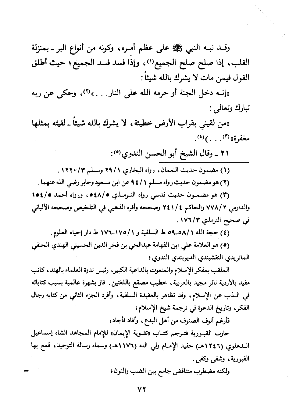 وقد نبه النبي صلى الله عليه وسلم على عظم أمره، وكونه من أنواع البر - بمنزلة القلب، إذا صلح صلح الجميع، وإذا فسد فسد الجميع؛ حيث أطلق القول فيمن مات لا يشرك بالله شيئًا: