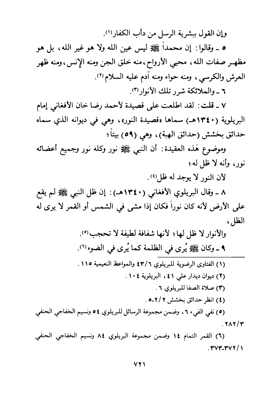 7 - قلت: لقد اطلعت على قصيدة لأحمد رضا خان الأفغاني إمام البريلوية (1340هـ) سماها " قصيدة النور "، وهي في ديوانه الذي سماه حدائق بخشش (حدائق الهبة) ، وهي (59) بيتا؛ وموضوع هذه العقيدة: أن النبي صلى الله عليه وسلم نور وكله نور وجميع أعضائه نور، وأنه لا ظل له؛ لأن النور لا يوجد له ظل.