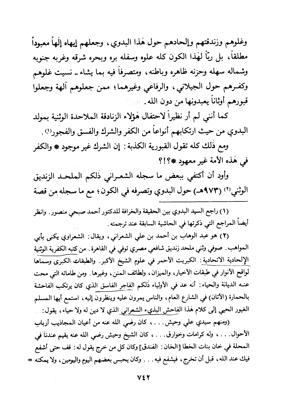 وغلوهم وزندقتهم وإلحادهم حول هذا البدوي، وجعلهم إياه إلها معبودا مطلقا، بل ربّا لهذا الكون كله علوه وسفله بره وبحره شرقه وغربه جنوبه وشماله سهله وحزنه ظاهره وباطنه، ومتصرفا فيه بما يشاء- نسيت غلوهم وكفرهم حول الجيلاني، والرفاعي وغيرهما؛ ممن جعلوهم آلهة وجعلوا قبورهم أوثانا يعبدونها من دون الله.