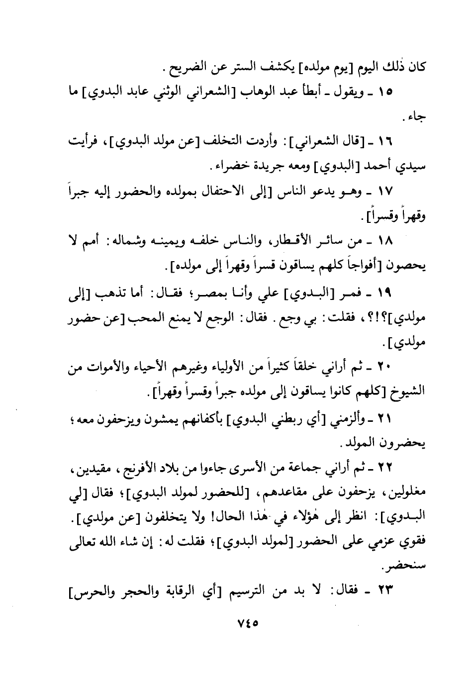 22 - ثم أراني جماعة من الأسرى جاءوا من بلاد الأفرنج، مقيدين، مغلولين، يزحفون على مقاعدهم، [للحضور لمولد البدوي] ؛ فقال [لي البدوي] : انظر إلى هؤلاء في هذا الحال! ولا يتخلفون [عن مولدي] .فقوي عزمي على الحضور [لمولد البدوي] ؛ فقلت له: إن شاء الله تعالى سنحضر.