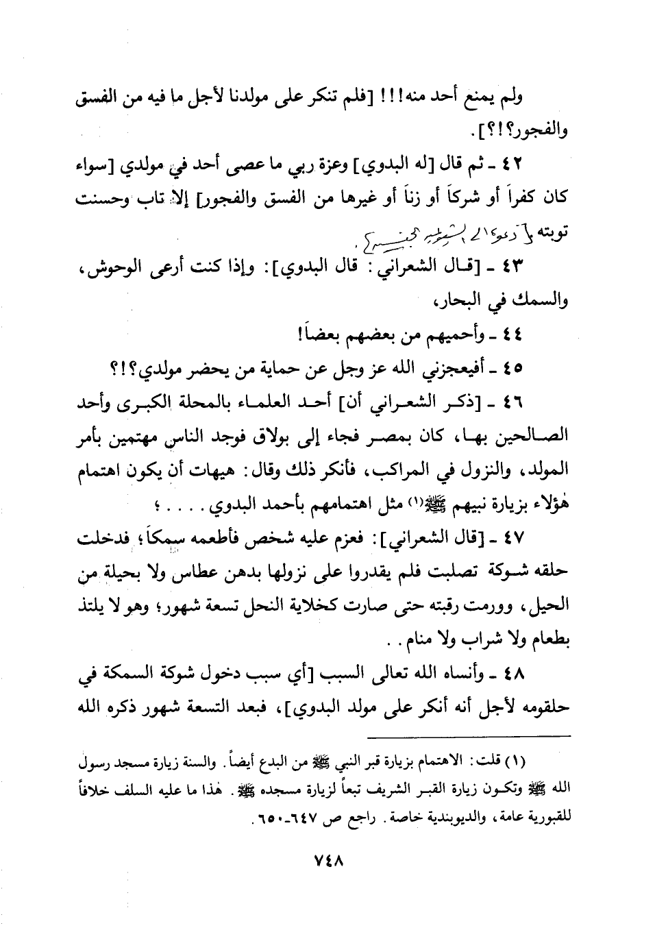 46 -[ذكر الشعراني أن] أحد العلماء بالمحلة الكبرى وأحد الصالحين بها، كان بمصر فجاء إلى بولاق فوجد الناس مهتمين بأمر المولد، والنزول في المراكب، فأنكر ذلك وقال: هيهات أن يكون اهتمام هؤلاء بزيارة نبيهم صلى الله عليه وسلم مثل اهتمامهم بأحمد البدوي ... ؛
