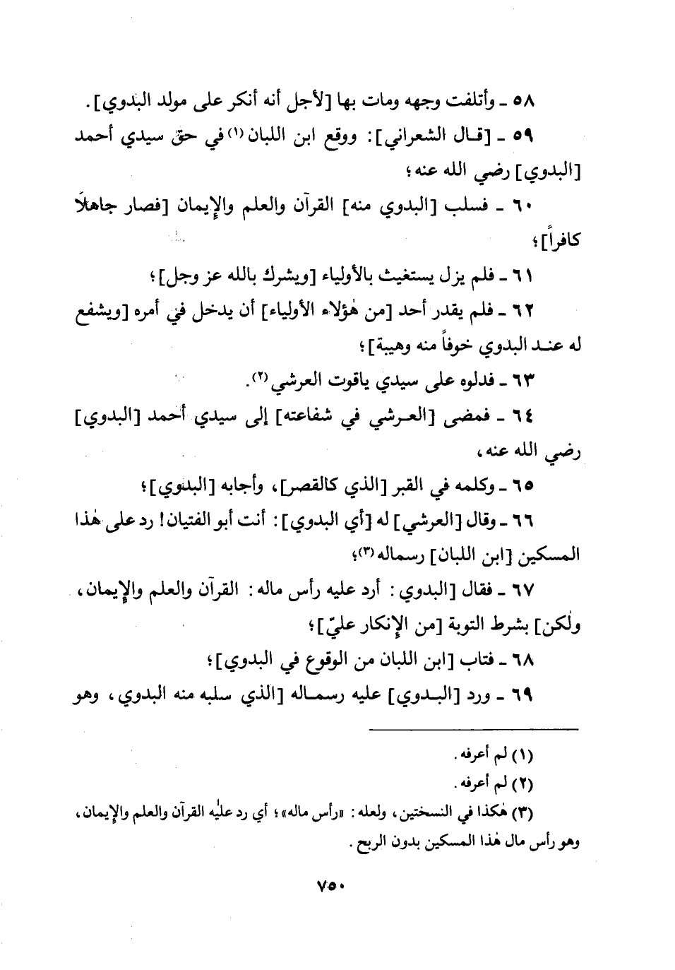 64 - فمضى [العرشي في شفاعته] إلى سيدي أحمد [البدوي] رضي الله عنه، 65- وكلمة في القبر [الذي كالقصر] ، وأجابه [البدوي] ؛ 66- وقال [العرشي] له [أي البدوي] : أنت أبو الفتيان! رد على هذا المسكين [ابن اللبان] رأسماله؛ 67- فقال [البدوي: أرد عليه رأس ماله: القرآن والعلم والإيمان، ولكن] بشرط التوبة [من الإنكار عليّ] ؛ 68- فتاب [ابن اللبان من الوقوع في البدوي] ؛ 69- ورد [البدوي] عليه رأسماله [الذي سلبه منه البدوي، وهو