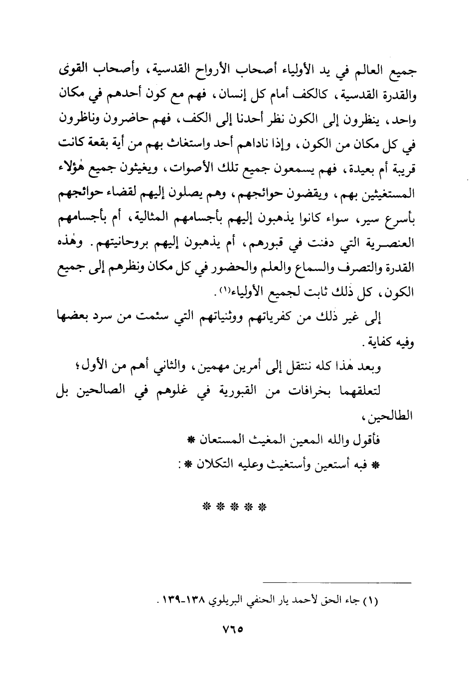 جميع العالم في يد الأولياء أصحاب الأرواح القدسية، وأصحاب القوى والقدرة القدسية، كالكف أمام كل إنسان، فهم مع كون أحدهم في مكان واحد، ينظرون إلى الكون نظر أحدنا إلى الكف، فهم حاضرون وناظرون في كل مكان من الكون، وإذا ناداهم أحد واستغاث بهم من أية بقعة كانت قريبة أم بعيدة، فهم يسمعون جميع تلك الأصوات، ويغيثون جميع هؤلاء المستغيثين بهم، ويقضون حوائجهم، وهم يصلون إليهم لقضاء حوائجهم بأسرع سير، سواء كانوا يذهبون إليهم بأجسامهم المثالية، أم بأجسامهم العنصرية التي دفنت في قبورهم، أم يذهبون إليهم بروحانيتهم. وهذه القدرة والتصرف والسماع والعلم والحضور في كل مكان ونظرهم إلى جميع الكون، كل ذلك ثابت لجميع الأولياء.