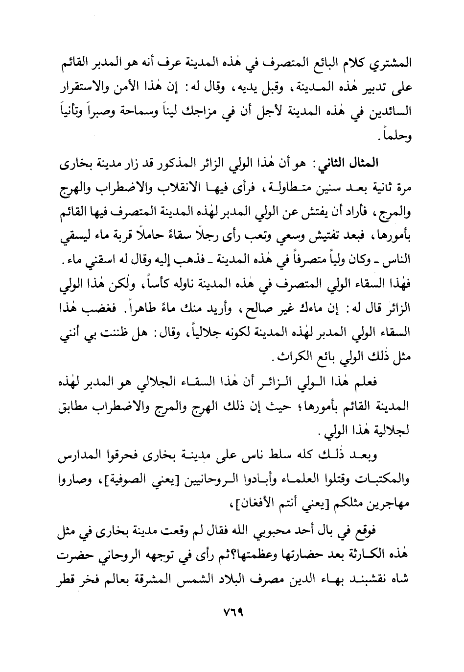 المثال الثاني: هو أن هذا الولي الزائر المذكور قد زار مدينة بخارى مرة ثانية بعد سنين متطاولة، فرأى فيها الانقلاب والاضطراب والهرج والمرج، فأراد أن يفتش عن الولي المدبر لهذه المدينة المتصرف فيها القائم بأمورها، فبعد تفتيش وسعي وتعب رأى رجلا سقاءً حاملا قربة ماء ليسقي الناس- وكان وليا متصرفا في هذه المدينة- فذهب إليه وقال له اسقني ماء. فهذا السقاء الولي المتصرف في هذه المدينة ناوله كأسا، ولكن هذا الولي الزائر قال له: إن ماءك غير صالح، وأريد منك ماءً طاهرا. فغضب هذا السقاء الولي المدبر لهذه المدينة لكونه جلاليا، وقال: هل ظننت بي أنني مثل ذلك الولي بائع الكراث.