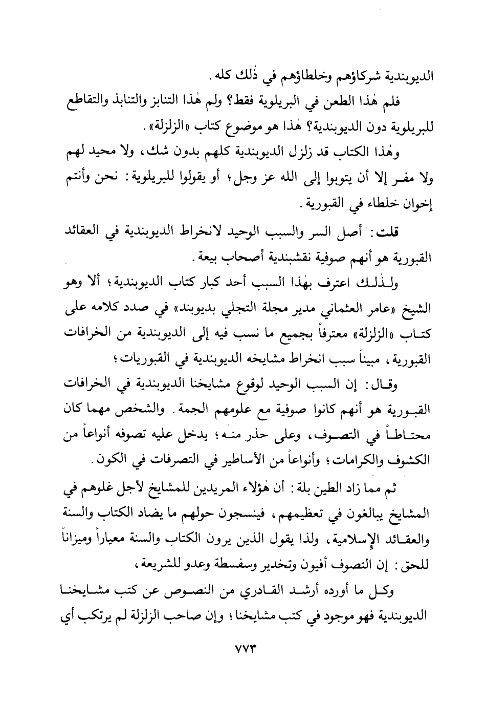 وهذا الكتاب قد زلزل الديوبندية كلهم بدون شك، ولا محيد لهم ولا مفر إلا أن يتوبوا إلى عز وجل؛ أو يقولوا للبريلوية: نحن وأنتم إخوان خلطاء في القبورية.