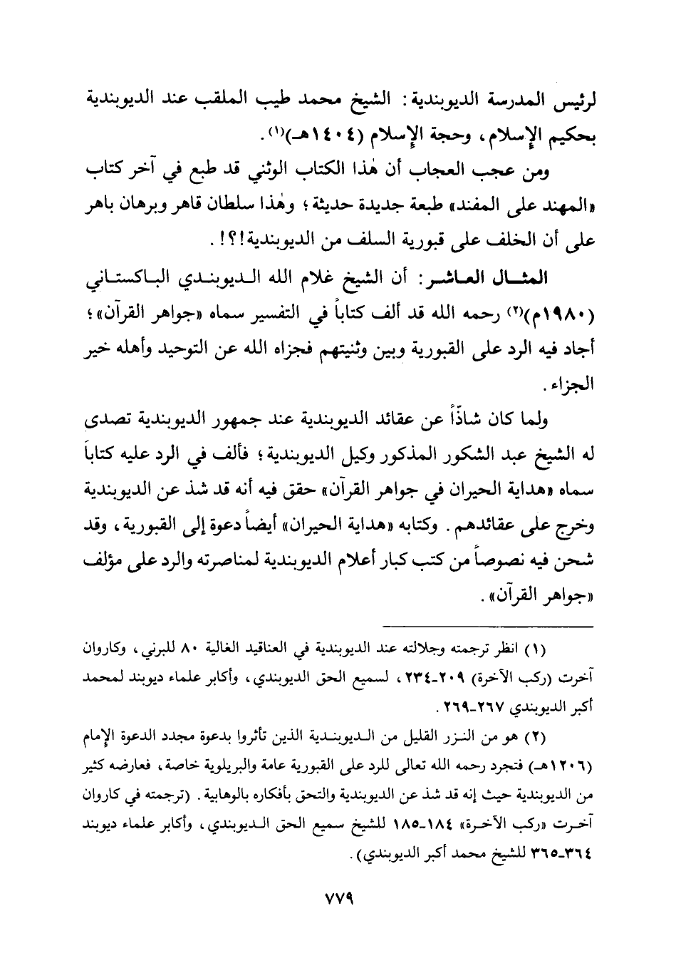 المثال العاشر: أن الشيخ غلام الله الديوبندي الباكستاني (1980م) رحمه الله قد ألف كتابا في التفسير سماه " جواهر القرآن "؛ أجاد فيه الرد على القبورية وبين وثنيتهم فجزاه الله عن التوحيد وأهله خير الجزاء.