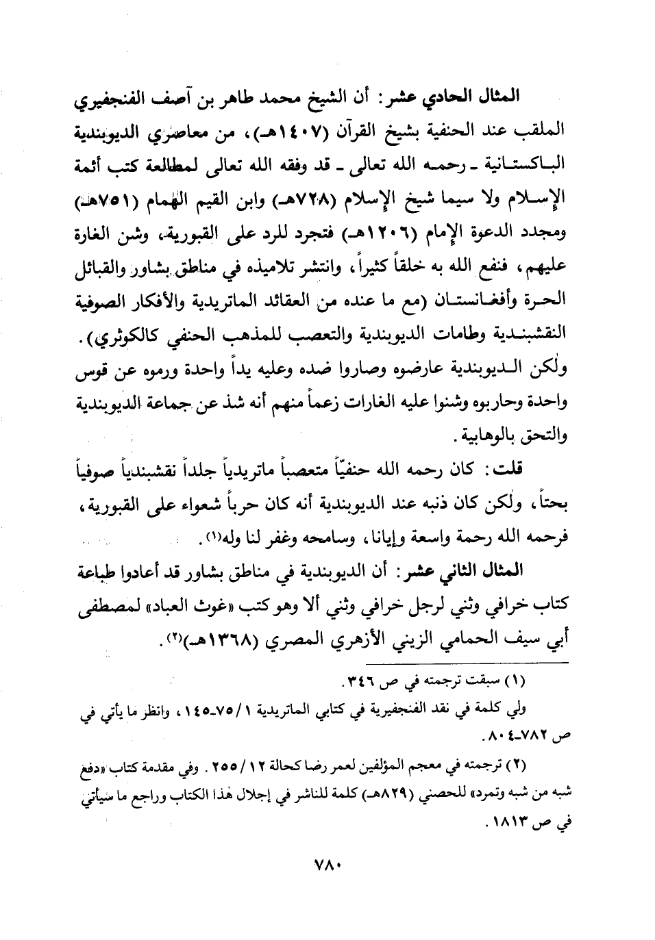 المثال الحادي عشر: أن الشيخ محمد طاهر بن آصف الفنجفيري الملقب عند الحنفية بشيخ القرآن (1407هـ) ، من معاصري الديوبندية الباكستانية-رحمه الله تعالى- قد وفقه الله تعالى لمطالعة كتب أئمة الإسلام ولا سيما شيخ الإسلام (728هـ) وابن القيم الهمام (751هـ) ومجدد الدعوة الإمام (1206هـ) فتجرد للرد على القبورية، وشن الغارة عليهم، فنفع الله به خلقا كثيرا، وانتشر تلاميذه في مناطق بشاور والقبائل الحرة وأفغانستان (مع ما عنده من العقائد الماتريدية والأفكار الصوفية النقشبندية وطامات الديوبندية والتعصب للمذهب الحنفي الكوثري) .
