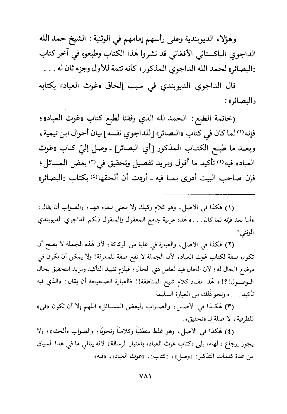 (خاتمة الطبع: الحمد لله الذي وفقنا لطبع كتاب " غوث العباد "؛ فإنه لما كان في كتاب " البصائر " [للداجوي نفسه] بيان أحوال ابن تيمية، وبعد ما طبع الكتاب المذكور [أي البصائر]- وصل إليّ كتاب " غوث العباد " فيه تأكيد ما أقول ومزيد تفصيل وتحقيق في بعض المسائل؛ فإن صاحب البيت أدرى بما فيه- أردت أن ألحقها بكتاب " البصائر "