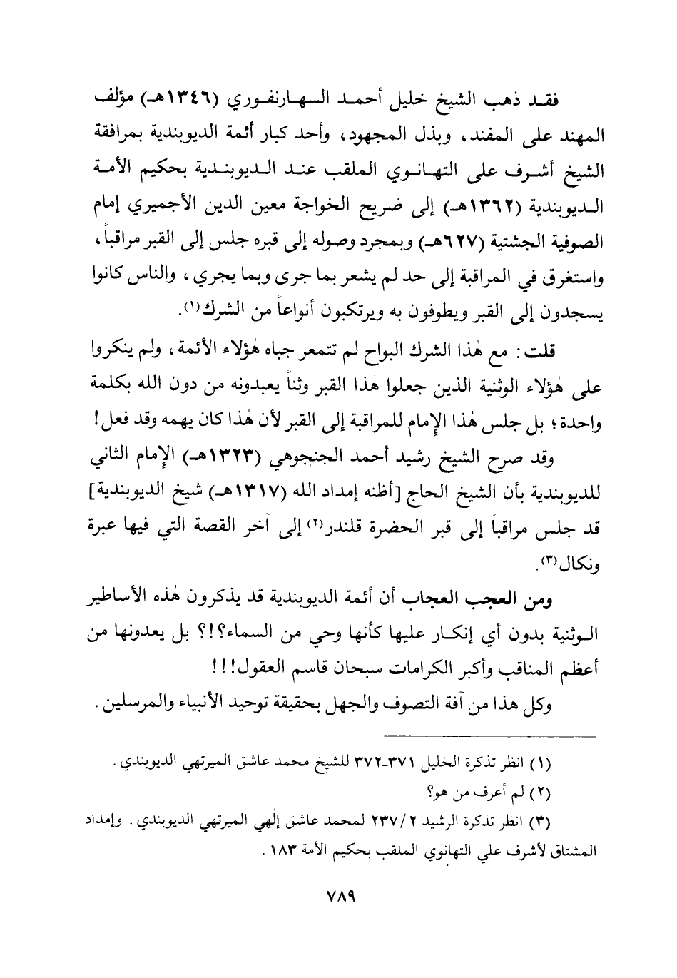 فقد ذهب الشيخ خليل أحمد السهارنفوري (1346هـ) مؤلف المهند على المفند، وبذل المجهود، وأحد كبار أئمة الديوبندية بمرافقة الشيخ أشرف علي التهانوي الملقب عند الديوبندية بحكيم الأمة الديوبندية (1362هـ) إلى ضريح الخواجة معين الدين الأجميري إمام الصوفية الجشتية (627هـ) وبمجرد وصوله إلى قبره جلس إلى القبر مراقبا، واستغرق في المراقبة إلى حد لم يشعر بما جرى وبما يجري، والناس كانوا يسجدون إلى القبر ويطوفون به ويرتكبون أنواعا من الشرك.