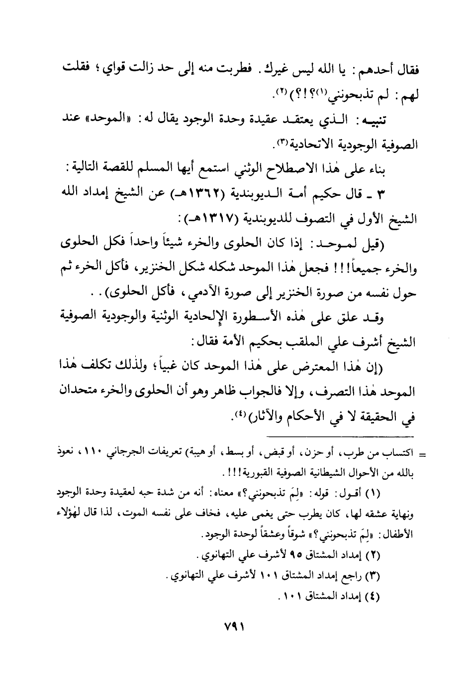 3 - قال حكيم أمة الديوبندية (1362هـ) عن الشيخ إمداد الله الشيخ الأول في التصوف للديوبندية (1317هـ) : (قيل لموحد: إذا كان الحلوى والخرء شيئا واحدا فكل الحلوى والخرء جميعا!!! فجعل هذا الموحد شكله شكل الخنزير، فأكل الخرء ثم حول نفسه من صورة الخنزير إلى صورة الآدمي، فأكل الحلوى) ...