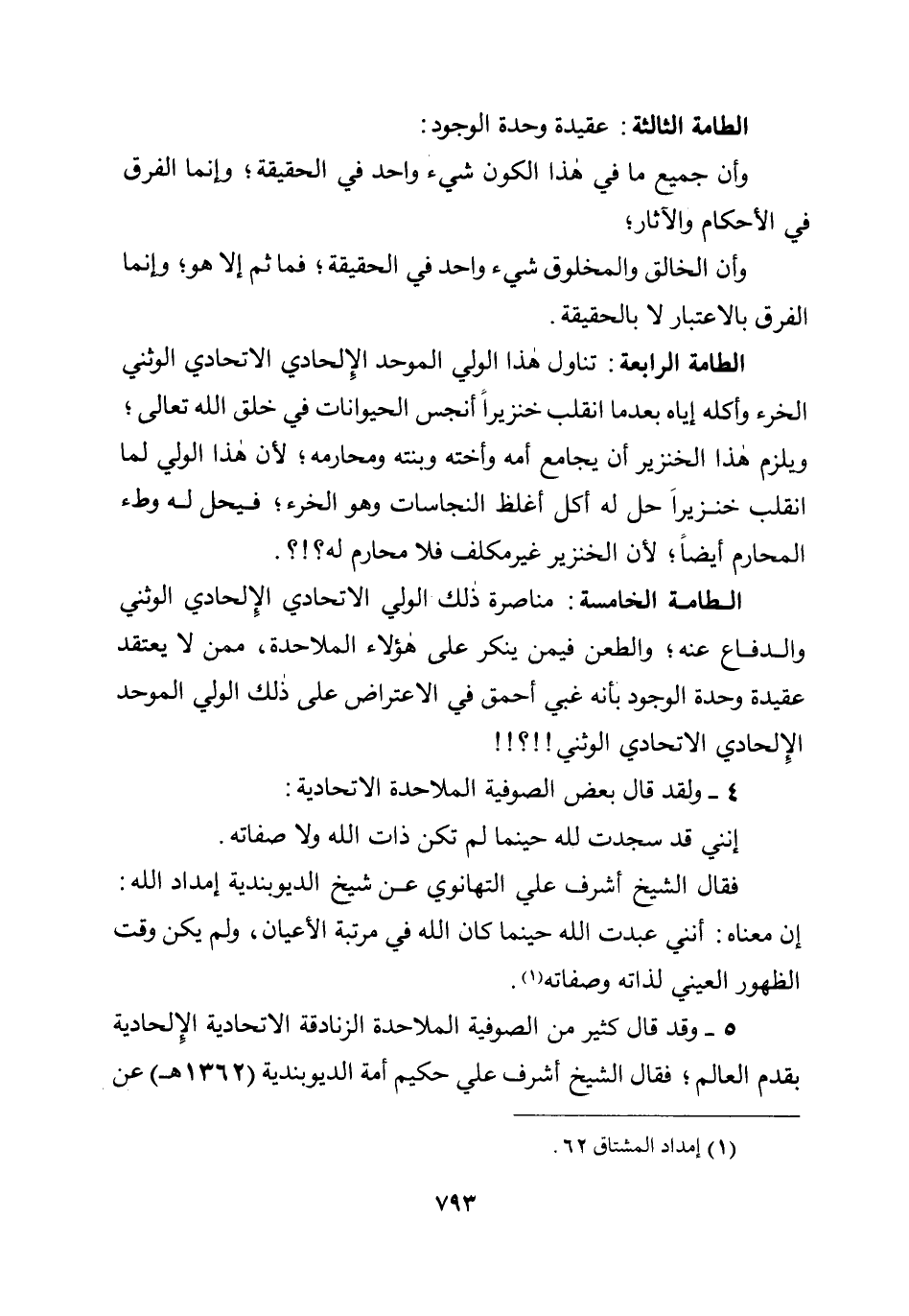 5 - وقد قال كثير من الصوفية الملاحدة الزنادقة الاتحادية الإلحادية بقدم العالم؛ فقال الشيخ أشرف علي حكيم أمة الديوبندية (1362هـ) عن