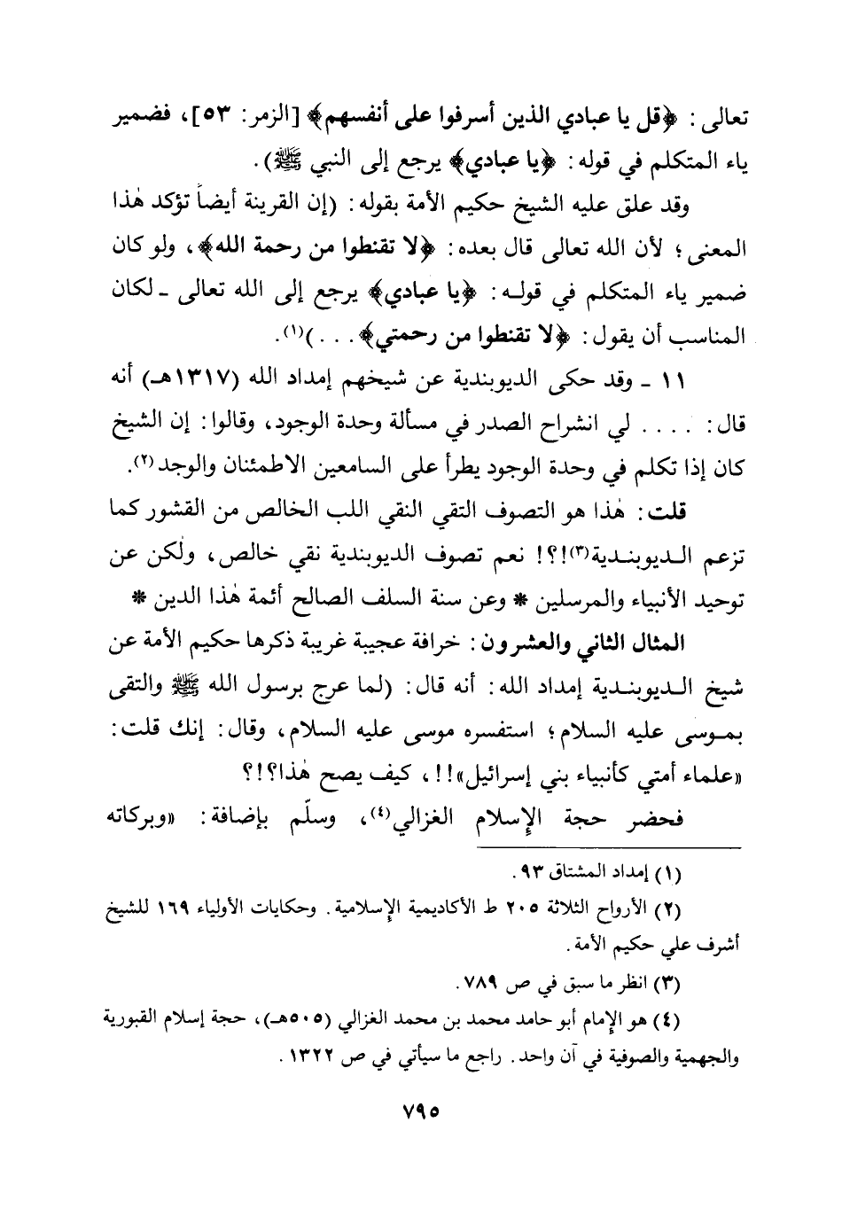 11 - وقد حكى الديوبندية عن شيخهم إمداد الله (1317هـ) أنه قال: ... لي انشراح الصدر في مسألة وحدة الوجود، وقالوا: إن الشيخ كان إذا تكلم في وحدة الوجود يطرأ على السامعين الاطمئنان والوجد.
