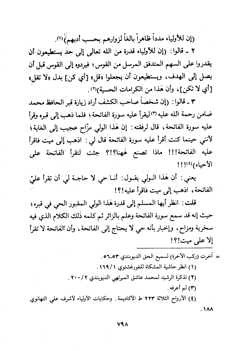 قلت: انظر أيها المسلم إلى قدرة هذا الولي المقبور الحي في قبره؛ حيث إنه قد سمع سورة الفاتحة وعلم بالزائر ثم كلمه ذلك الكلام الذي فيه سخرية ومزاح، وإخبار بأنه حي لا يحتاج إلى الفاتحة، وأن الفاتحة لا تقرأ إلى على ميت!؟!